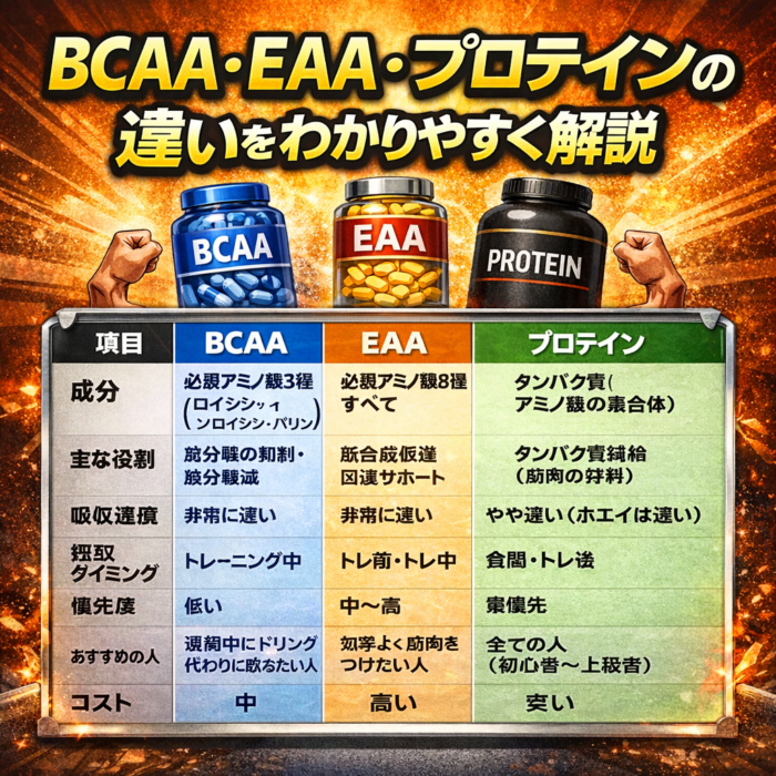 BCAA・EAA・プロテインの違いをわかりやすく解説
