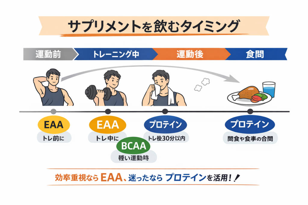 まずは食事を整え、必要に応じてプロテインを取り入れ、それでもさらに効率を求めるならEAAを検討する、という順番の方が失敗しにくいです。