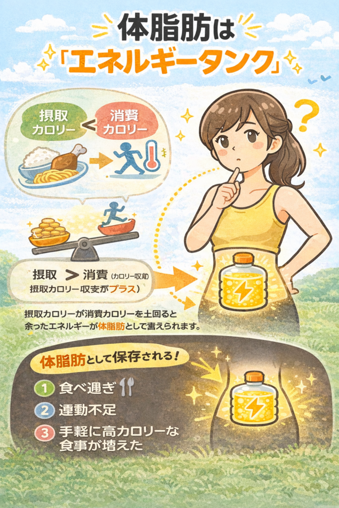 体脂肪は、摂取カロリーが消費カロリーを上回ったときに増えます。