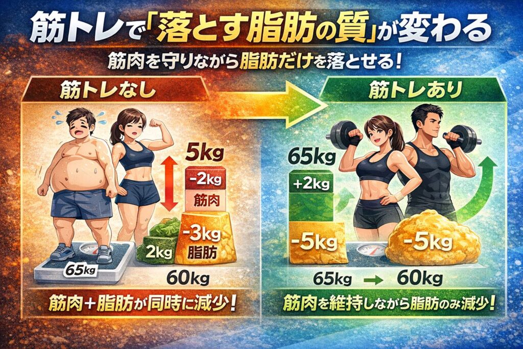 筋トレを取り入れることで、単に体重を落とすのではなく「脂肪だけを落とす」状態を作ることができます。