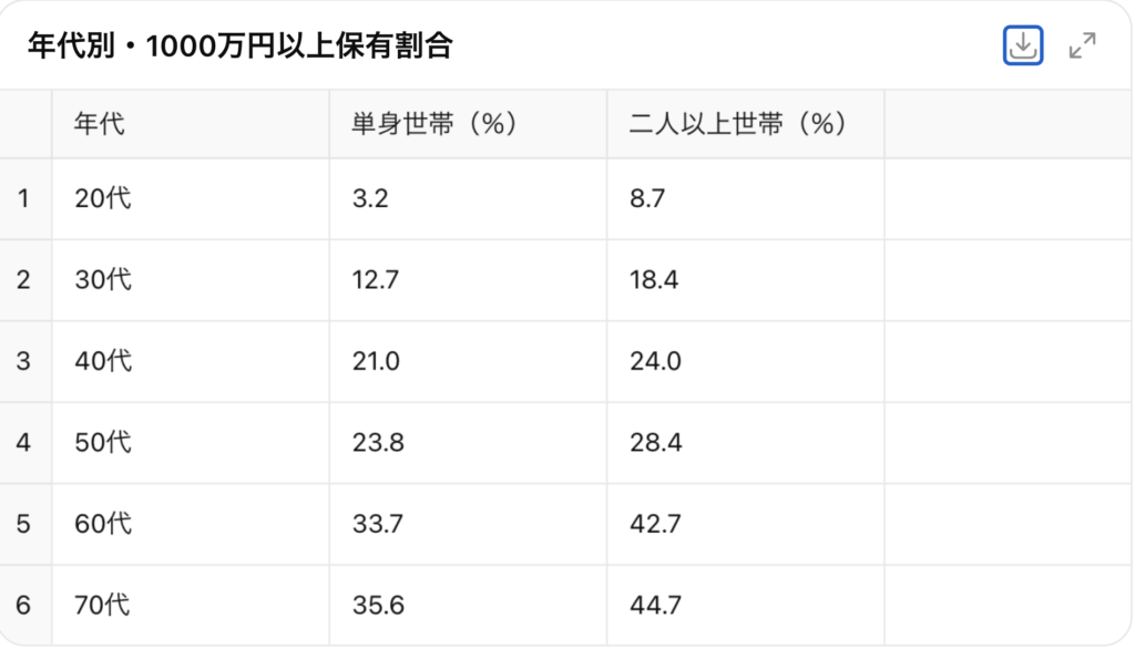 りそなバンクの統計によると若いうちは“1000万円なんてほぼ誰も持ってない” のが数字でハッキリ出ています。