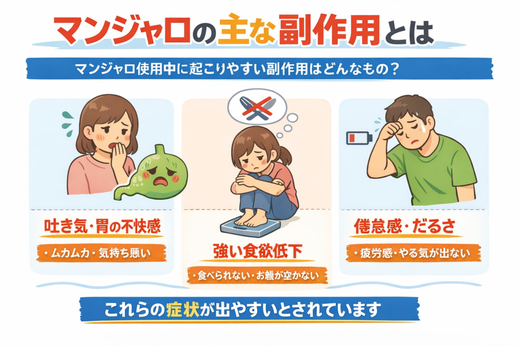 マンジャロを使用すると、多くの方が何らかの副作用を感じます。特にダイエット目的で使用している場合、急激な食事量の変化や体内環境の変化により、体が一時的に適応しきれず不調が出やすくなります。