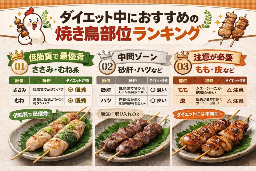 ここでは、ダイエット中に選ぶべき焼き鳥の部位を「優先度別」に分かりやすく解説します。